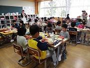今日から1年生の給食がはじまりました。1年生にとって初めての給食は、人気のハンバーグでした。今回は、和風ソースをかけていただきました。たっぷりの大根とにんにく・しょうが・しょうゆ・酢などを加熱して作ったソースは、さっぱりとしていて、こどもたちにとても好評でした。