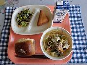 久しぶりに味噌ラーメンが出ました。給食では、麺がのびないようにスープと麺を別々にしましたので、ラーメンスープに、麺を少しずつ入れながら食べました。スープには、豚肉の他に、ナルトやにんじん・もやし・ねぎなどいろいろな材料が入っています。