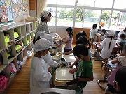 いつもおいしい給食をありがとうございます。調理員さんにあいさつをしてから配膳をします。