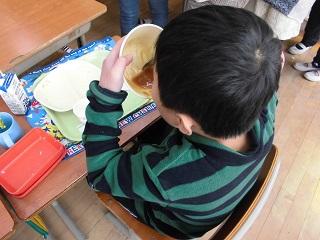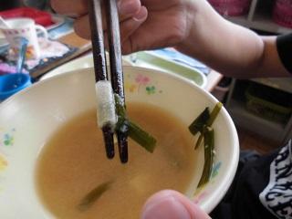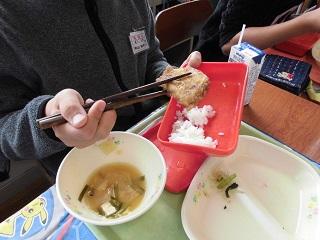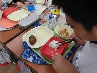 低学年は、箸だけで納豆を食べるのは、少し大変です。ですが、あえてスプーンは出していません。がんばって、箸で食べます。