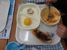 今日の献立は、コッペパン ピーナッツクリーム スパニッシュオムレツ ミートソースグラタン