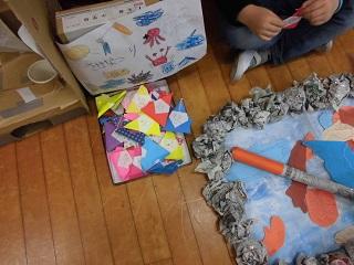 ストローにビニールの袋をつけて、ふーっとふくらますものやビックリばこやお面を作りました。