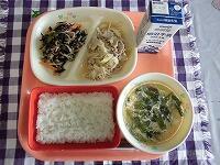 給食では、毎月、地域の特色ある給食メニューをとり入れています。今日は、さくら市の給食メニューの中から、「春菊のツナあえ」をとり入れました。さくら市の特産物のひとつに春菊があります。春菊には、風邪予防となるビタミンAのほかに、鉄分やカルシウムなど不足しがちな栄養素がたくさん含まれています。春菊は独特の香りがあるため、苦手な人もいると思います。給食では、みなさんがおいしく食べられるように、ツナとマヨネーズを使って食べやすく作りました。