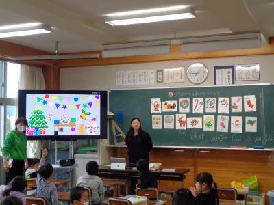 外国語活動の授業。本時では、クリスマスに関する言い方を学びました。クイズ形式で授業が進み、子どもたちは楽しく学んでいました