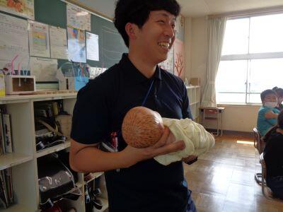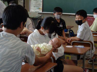 思春期の心と体の変化や生命誕生の分かりやすい説明を聞いた後、赤ちゃん人形抱っこ体験・妊婦ジャケット体験などがあり、子どもたちは意欲的に学ぶことができました。命の大切さを実感するすばらしい機会となりました。