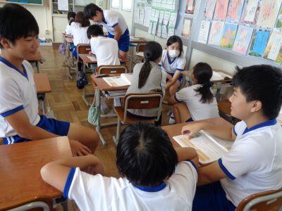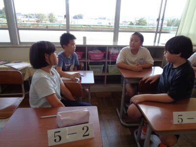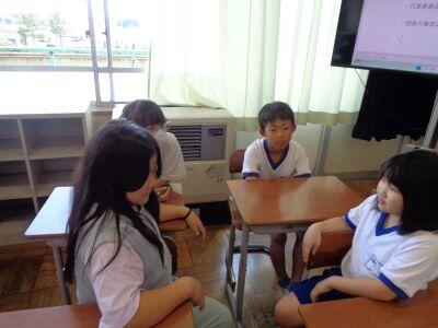 道徳科の授業。自分の意見や考えを、友達に伝えています笑う