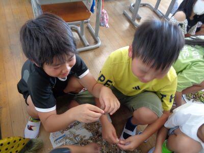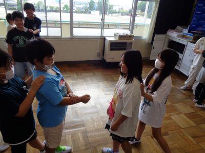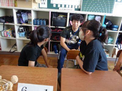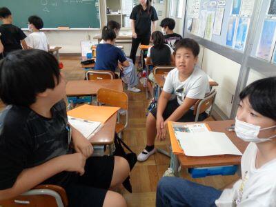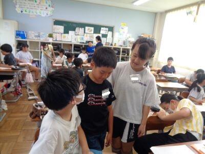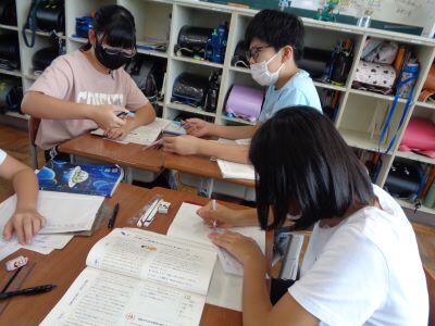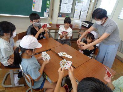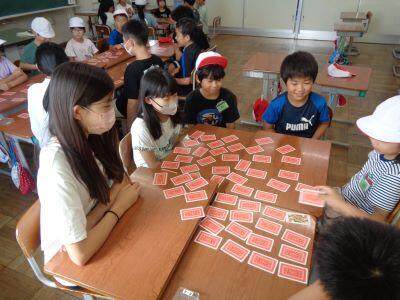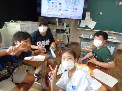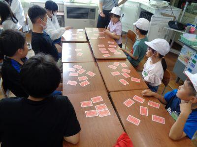 本時の昼休みは"わくわくタイム"となっており、全校生が縦割り班ごとに活動しました。ただし、暑さ指数が「厳重警戒レベル」だったため、冷房の効いた各教室での活動となりました。