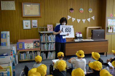 ボランティアの方が読み聞かせで準備した本を、学校に寄贈していただきました。誠にありがとうございましたお辞儀
