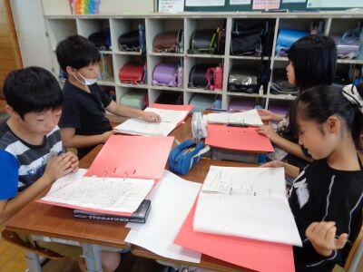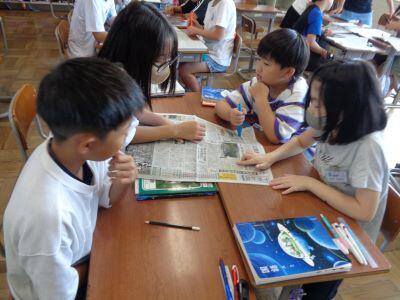 2組では、国語科授業で新聞づくりの話合いがグループごとに行われていました。