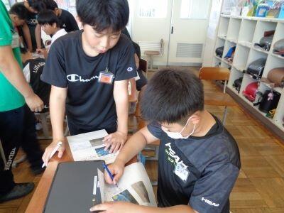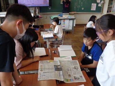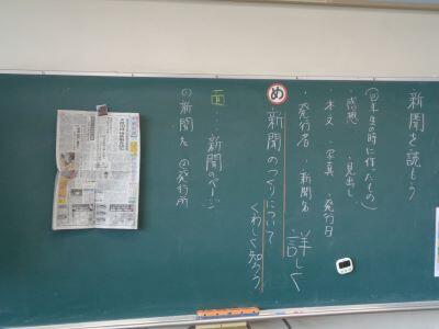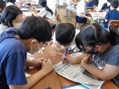 国語科の学習で、新聞のつくりについて詳しく学んでいます笑う