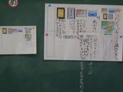 国語科の授業。ポスターの工夫について、実例をもとにして考えていきました期待・ワクワク
