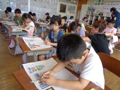 4年国語授業の様子。1組・2組ともに、「新聞づくり」に取り組んでいます。割り付けの基本を学んだり、紙面構成の具体的な設定を体験したりしながら、一人一人の集中力が高まっている様子ですキラキラ