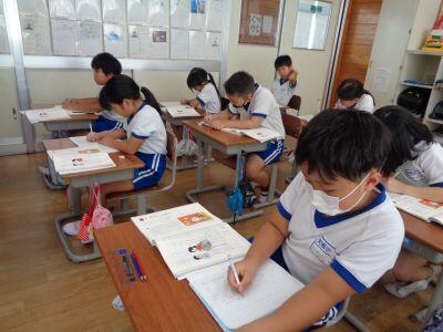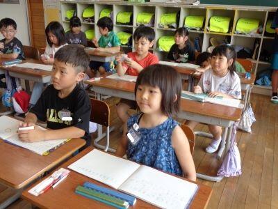 1年教室フロアに足を延ばすと、1組は書写、2組は国語の授業に取り組んでいました。