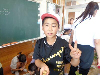 畑で収穫した大豆を選別しています。子どもたちの表情が、とても生き生きしてますね喜ぶ・デレ