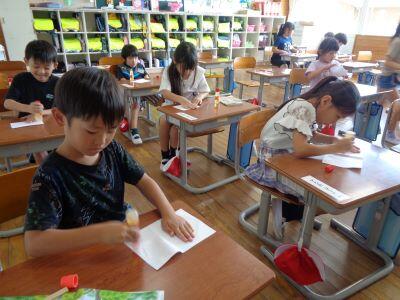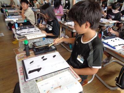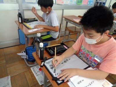書写で毛筆に取り組んでいます。小筆を使い、いつもより多い文字を書いていきました笑う