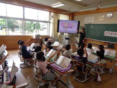 先生が流す楽曲に合わせて、大きな声で歌ったりリズムをとって演奏したり…。楽しく、一生懸命に学ぶ姿が見られましたにっこり