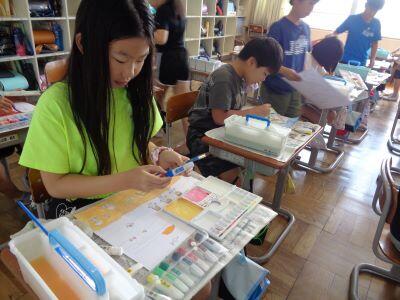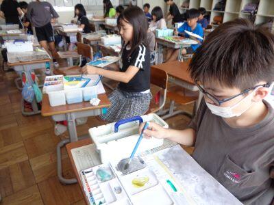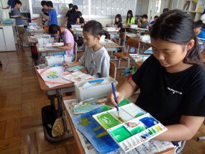 図画工作科の授業。絵の具の色によって、「自分の気持ち」を表現しています喜ぶ・デレ