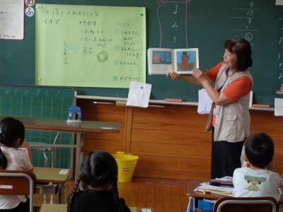 1年生の授業風景。校内を巡視すると、1組は音楽、2組は算数の授業が行われていました。
