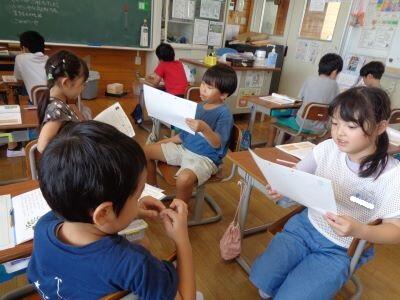 2年生の国語授業。1組と2組の教室に行くと、子どもたちが意欲的に学習活動に取り組む姿が見られます。