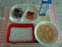 今日の給食は「ごはん 牛乳 豚肉入りコロッケ 小松菜のじゃこサラダ かきたま汁」でした。