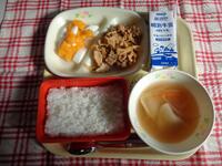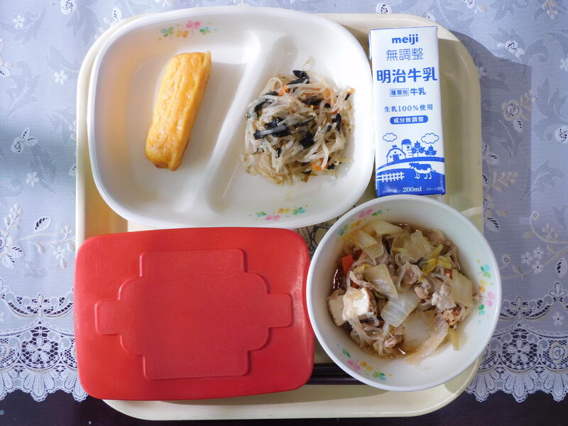 今日の献立は、「ごはん 厚焼き玉子 もやしと海苔のあえもの すき焼き風煮 牛乳」でした。