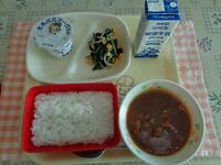 今日の献立は、「ごはん ミートボールカレー ほうれん草とコーンのサラダ ヨーグルト 牛乳」でした。