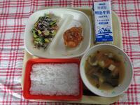 今日の献立は、「ごはん 鶏肉の照り焼き ツナのり酢あえ 里芋のみそ汁 牛乳」でした。