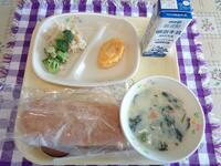 今日の献立は、「コッペパン チリコンカン ゆずカツオサラダ かぼちゃのミルクスープ 牛乳」でした。