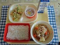 今日の献立は、「ごはん モロのあっぷるソース かんぴょうのごまあえ 豆乳仕立ての野菜汁 牛乳」でした。