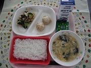 今日の献立は、「わかめごはん 野菜コロッケ ゆかりあえ 鶏団子汁 牛乳」でした。
