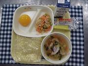 今日の献立は、「食パン りんごジャム コロッケ チーズとコーンのサラダ 白菜のスープ 牛乳」でした。