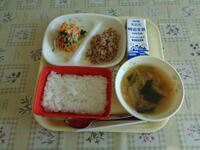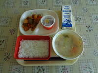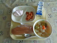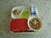 今日の給食は「ごはん 牛乳 納豆 インド煮 豆乳仕立ての野菜汁」でした。