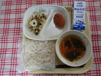 今日の給食は「きつねうどん 牛乳 コーンフライ 竹輪のごまドレッシング和えでした。