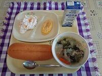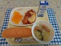 今日の献立は、「フルーツクリームパン トマトミートオムレツ 野菜スープ 牛乳」でした。