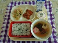 今日の献立は、「わかめごはん 鶏のから揚げ 菜の花のおひたし すまし汁 お祝いデザート 牛乳」でした。