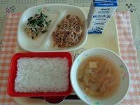 今日の献立は、「ごはん 豚肉のしょうが焼き ほうれん草のツナマヨあえ けんちん汁 牛乳」でした。