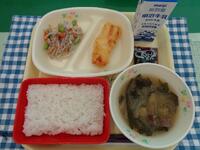 今日の献立は、「ごはん いかメンチ のり酢あえ 豆乳仕立ての野菜汁 牛乳」でした。
