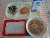 今日の献立は、「ごはん ミンチカツ 千草あえ 豆乳仕立ての野菜汁 牛乳」でした。