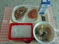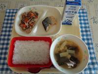 今日の献立は、「ごはん いわしのおかか煮 春雨のマヨネーズあえ みそけんちん汁 牛乳」でした。
