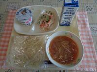 今日の献立は、「ミートソーススパゲティ イタリアンサラダ ヨーグルト 牛乳」でした。
