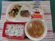 川崎小学校6年生が考えた献立です。わかめを主食にして、さばの味噌煮や具だくさんの汁物を組み合わせた和食中心の献立です。今日も、野菜たっぷりで栄養満点です。