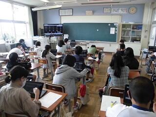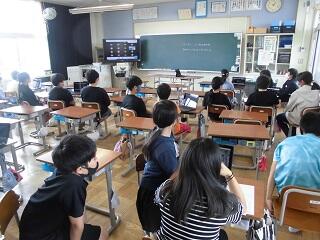 昼休みの時間を使って、6年生が「県民の日集会」の準備に取り組んでいます。この日は、リハーサルということで、6年生一人一人が自分のタブレットに映し出された“代表児童が進行する様子”を視聴しました。