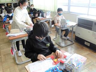 5年生の理科は「電流と電磁石」という単元で、一人一人が実験セットを使って課題を解決しています。自分で予想を立て、結果がどうなるかを確かめながら楽しく学習を進めています。