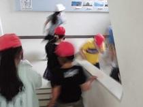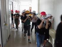 地震がおさまった後、火災が発生したという想定になり、子どもたちは避難経路を確認しながら校庭に避難しました。赤白帽子をかぶり、どの子も真剣態度で避難訓練に参加していました。