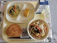 今日の献立は、「米粉パン とちおとめジャム 厚焼き卵 じゃこのサラダ 煮込みうどん 牛乳」でした。