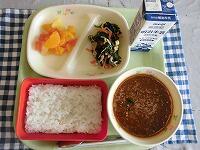 今日の献立は、「ごはん キーマカレー ポパイサラダ フルーツのいちごゼリーあえ 牛乳」です。