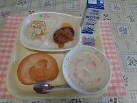 今日の献立は、「米粉パン とちおとめジャム りんごソースハンバーグ 大豆のシチュー 牛乳」でした。
