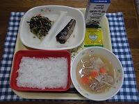 今日の献立は、「ごはん いわしの生姜煮 小松菜の磯あえ どさんこ汁 ふりかけ 牛乳」でした。