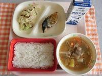 今日の献立は、「ごはん さばの塩焼き 塩昆布あえ さつまいも汁 牛乳」でした。