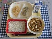 今日の献立は、「ごはん てんぐにらまんじゅう もやしキムチあえ マーボー豆腐 牛乳」でした。